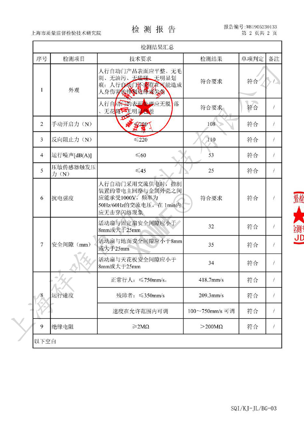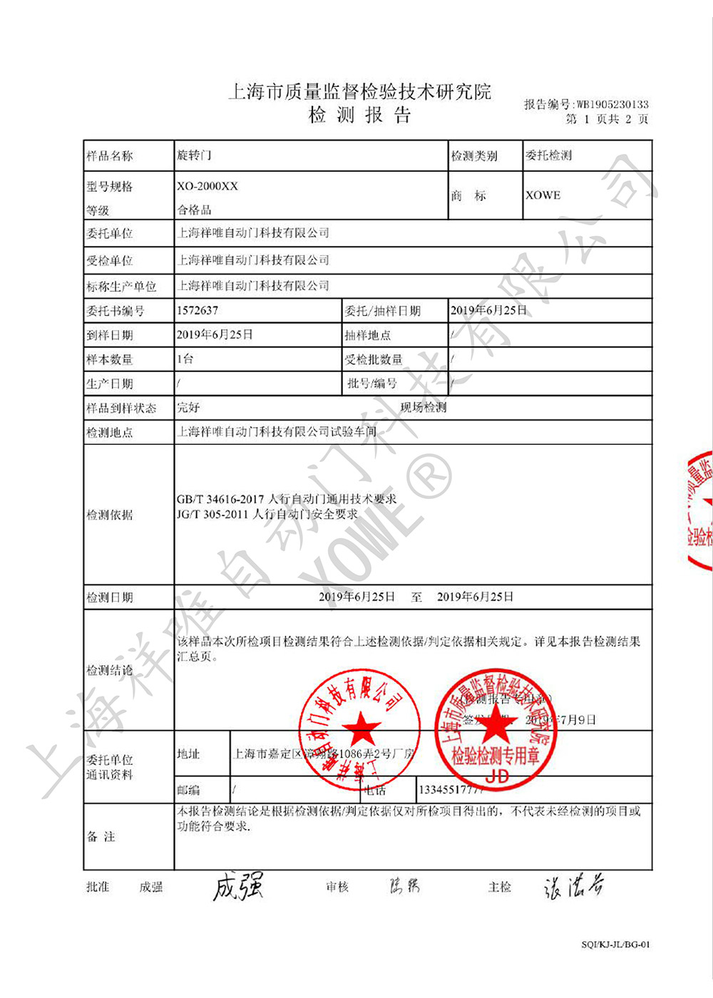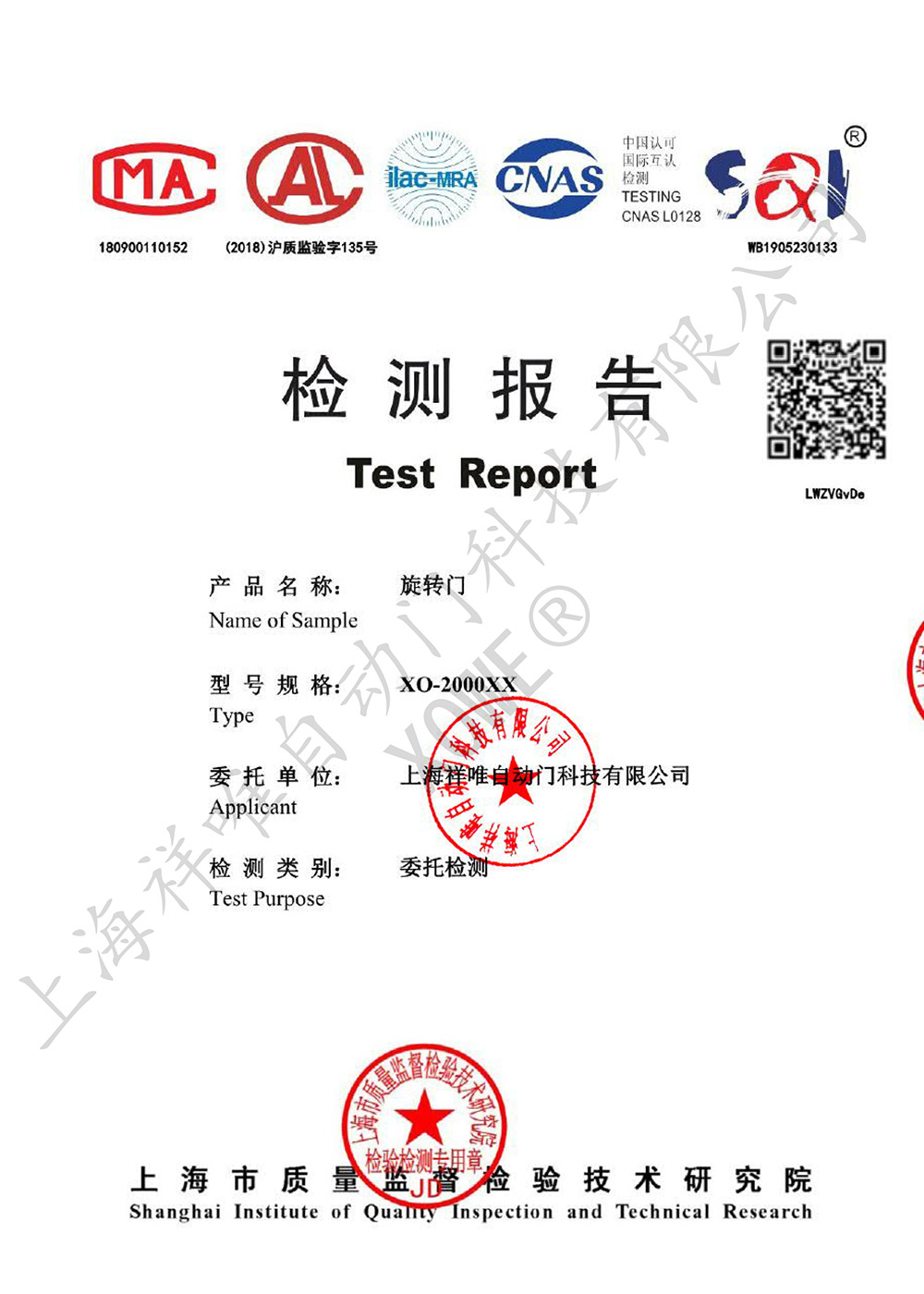 上海祥自動門科技有(yǒu)限(xiàn)公司旗下旋轉門檢測報告