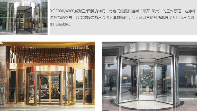 XO4000係列四翼旋轉門(mén),以造型簡潔、美觀及經濟適用廣泛應用(yòng)於寫(xiě)字樓、酒店、商場、機場等場(chǎng)所,同時兼(jiān)顧建築物進出口高通過性和環境隔(gé)離這兩個完(wán)全相反的要(yào)求,有效地起到了(le)放風、防塵、隔音的作用,並具(jù)備了極高的安全係數(shù),並在安全防夾、防碰、調速等(děng)性能上都具有優越的表(biǎo)現,從而改善入口附近的環境,若加上(shàng)展箱裝置,更增添(tiān)了完美的裝飾效果。